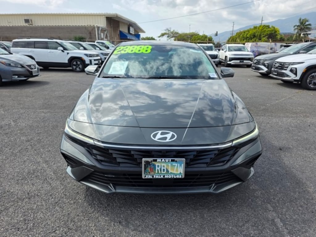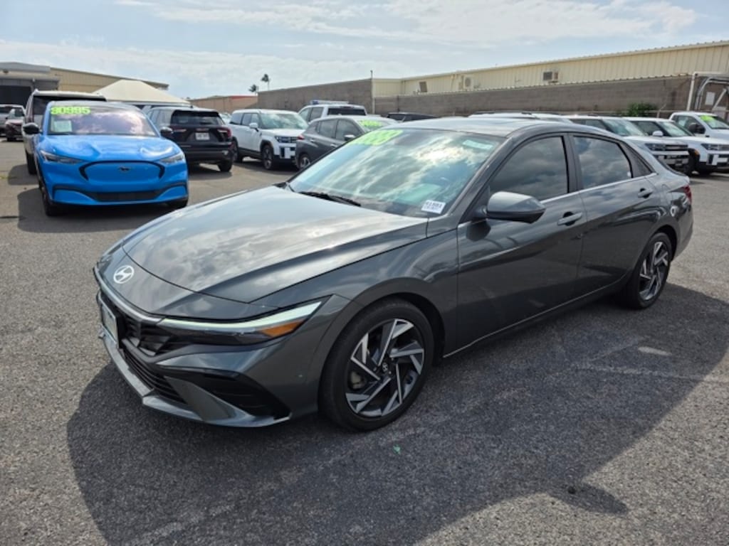 This Hyundai Elantra has many features and is well equipped including Option Group 01, 17" x 7.0J Alloy Wheels, 4-Wheel Disc Brakes, 8 Speakers, ABS brakes, Air Conditioning, Alloy wheels, AM/FM radio: SiriusXM, Apple CarPlay & Android Auto, Auto High-beam Headlights, Auto-dimming Rear-View mirror, Automatic temperature control, Brake assist, Bumpers: body-color, Cargo Net, Cargo Side Bins, Carpeted Floor Mats, Delay-off headlights, Driver door bin, Driver vanity mirror, Dual front impact airbags, Dual front side impact airbags, Electronic Stability Control, Emergency communication system: Bluelink+, Front anti-roll bar, Front Bucket Seats, Front Center Armrest, Front dual zone A/C, Front reading lights, Front wheel independent suspension, Fully automatic headlights, Heated door mirrors, Heated Front Bucket Seats, Heated front seats, Illuminated entry, Leatherette Seats, Low tire pressure warning, Navigation System, Occupant sensing airbag, Outside temperature display, Overhead airbag, Overhead console, Panic alarm, Passenger door bin, Passenger vanity mirror, Power door mirrors, Power driver seat, Power moonroof, Power steering, Power windows, Radio: AM/FM/HD/SiriusXM Display Audio, Rear seat center armrest, Rear side impact airbag, Rear window defroster, Remote keyless entry, Reversible Cargo Tray, Security system, Speed control, Speed-sensing steering, Split folding rear seat, Steering wheel mounted audio controls, Tachometer, Telescoping steering wheel, Tilt steering wheel, Traction control, Trip computer, Turn signal indicator mirrors, Variably intermittent wipers, and Wheel Locks. Amazon Gray 2024 Hyundai Elantra Limited FWD CVT I4