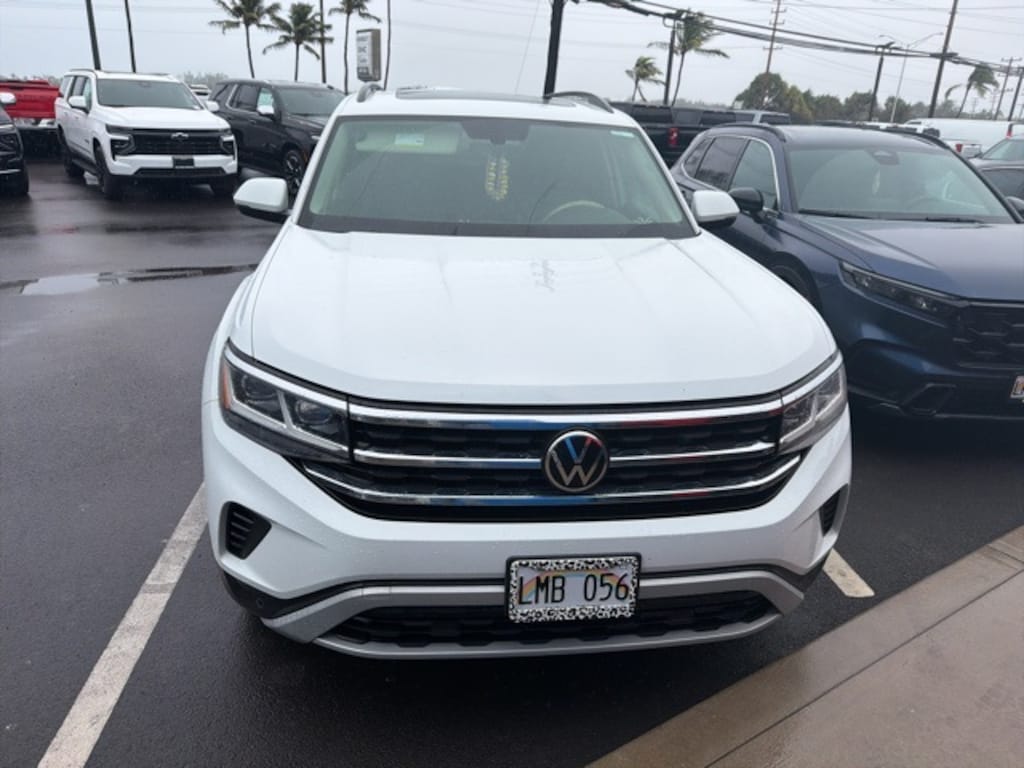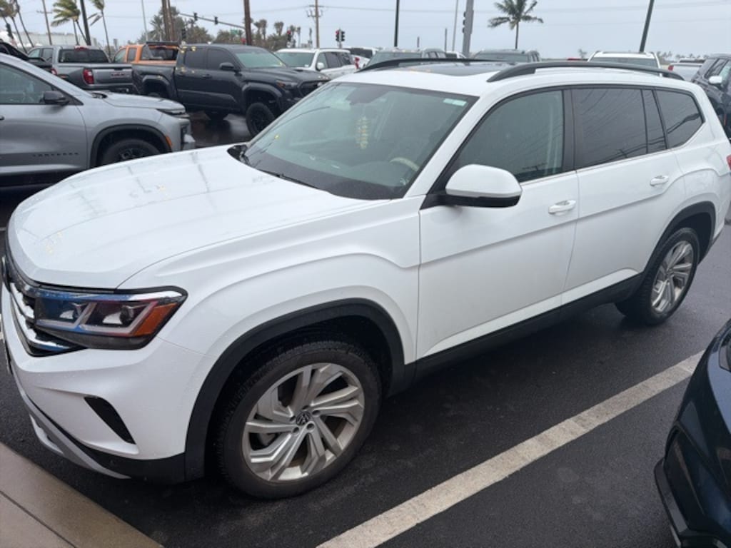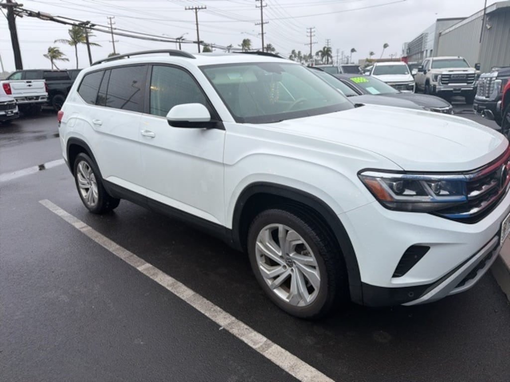 This Volkswagen Atlas has many features and is well equipped including Panoramic Sunroof Package, Towing Package, Trailer Hitch Extras, 2nd-Row Dual Captain's Chairs, 3.60 Axle Ratio, 3rd row seats: split-bench, 4-Wheel Disc Brakes, 6 Speakers, ABS brakes, Air Conditioning, Alloy wheels, Auto-dimming Rear-View mirror, Automatic temperature control, Brake assist, Bumpers: body-color, Compass, Delay-off headlights, Driver door bin, Driver vanity mirror, Dual front impact airbags, Dual front side impact airbags, Electronic Stability Control, Emergency communication system: VW Car-Net services (capabilities require enrollment or subscription), Exterior Parking Camera Rear, First Aid Kit, Forward collision: FCW w/Autonomous Emergency Braking mitigation, Four wheel independent suspension, Frameless Self-Dimming Rearview Mirror, Front anti-roll bar, Front Bucket Seats, Front Center Armrest, Front dual zone A/C, Front fog lights, Front reading lights, Fully automatic headlights, Heated Comfort Front Bucket Seats, Heated door mirrors, Heated front seats, Illuminated entry, Leather Shift Knob, Low tire pressure warning, Occupant sensing airbag, Outside temperature display, Overhead airbag, Overhead console, Panic alarm, Passenger door bin, Passenger vanity mirror, Perforated V-Tex Leatherette Seating Surfaces, Power door mirrors, Power driver seat, Power Liftgate, Power steering, Power windows, Privacy Cover, Radio data system, Rain sensing wipers, Rear air conditioning, Rear anti-roll bar, Rear reading lights, Rear seat center armrest, Rear window defroster, Rear window wiper, Remote keyless entry, Roadside Assistance Kit, Roof rack: rails only, Security system, Speed control, Speed-sensing steering, Split folding rear seat, Spoiler, Standard Suspension, Steering wheel mounted audio controls, Tachometer, Telescoping steering wheel, Tilt steering wheel, Traction control, Trip computer, Turn signal indicator mirrors, Variably intermittent wipers, and Wheels: 20" 5-Spoke Silver Alloy. Pure White 2021 Volkswagen Atlas 3.6L V6 SE w/Technology FWD 8-Speed Automatic with Tiptronic 3.6L VR6